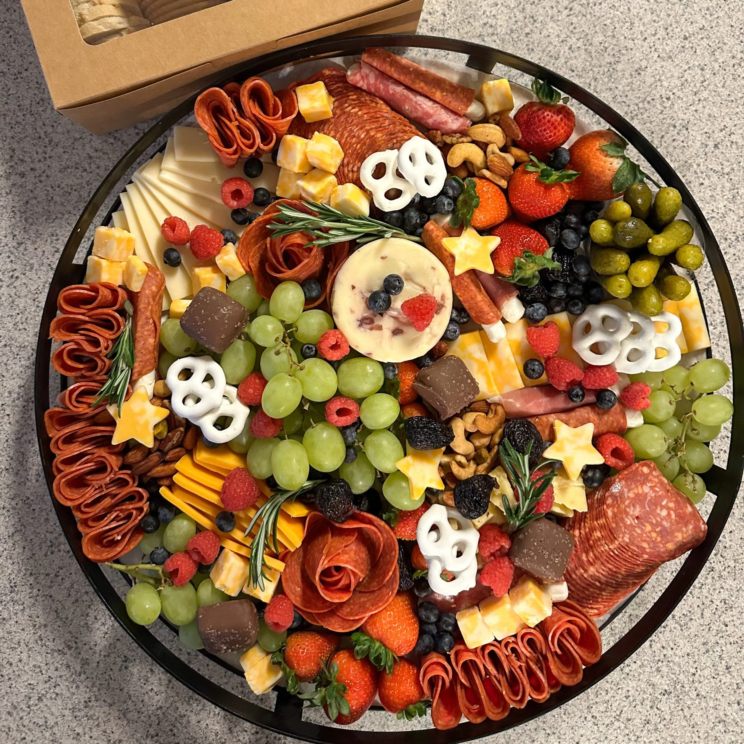 (3 cheeses, 2 meats, 1 dip, 2 fruit/veggie, pickled item, assorted crackers)